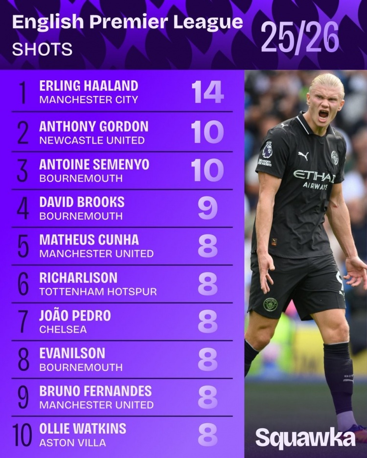 9月3日讯 数据机构squakwa统计了新赛季英超球员射门情况,哈兰德独自领跑。