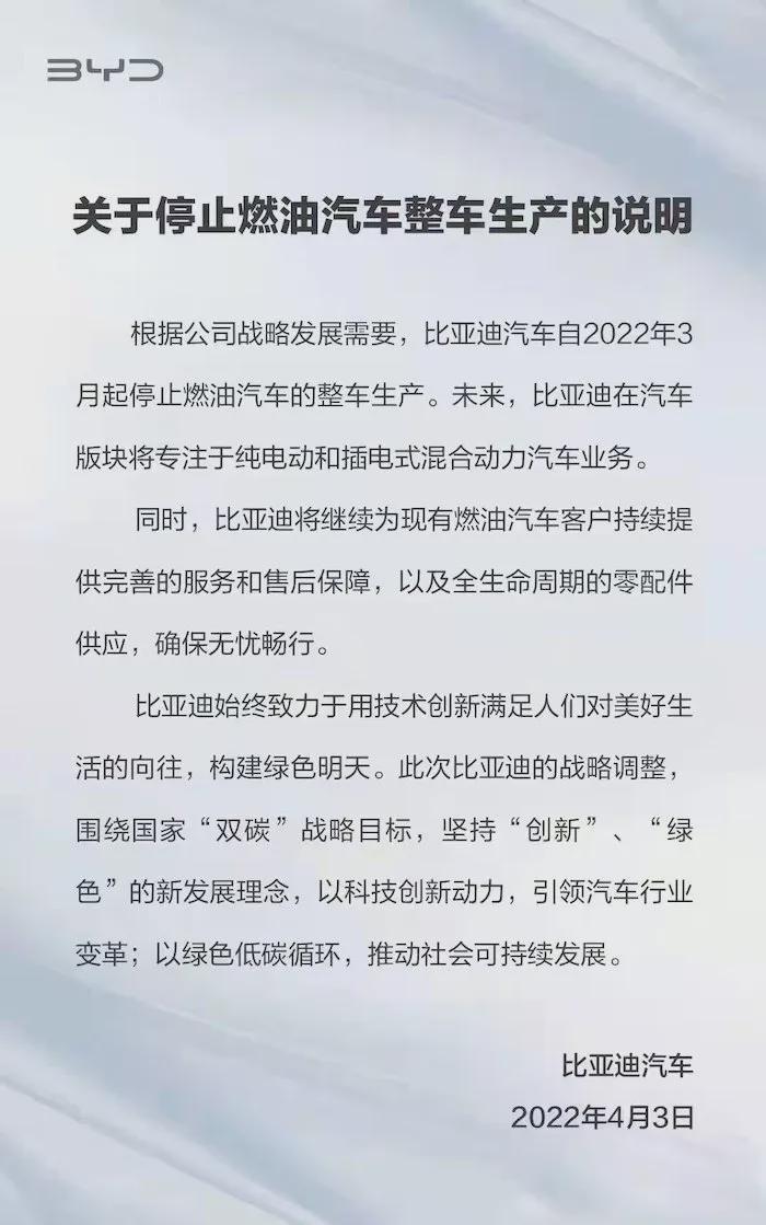图/比亚迪发布公告停止燃油车整车生产