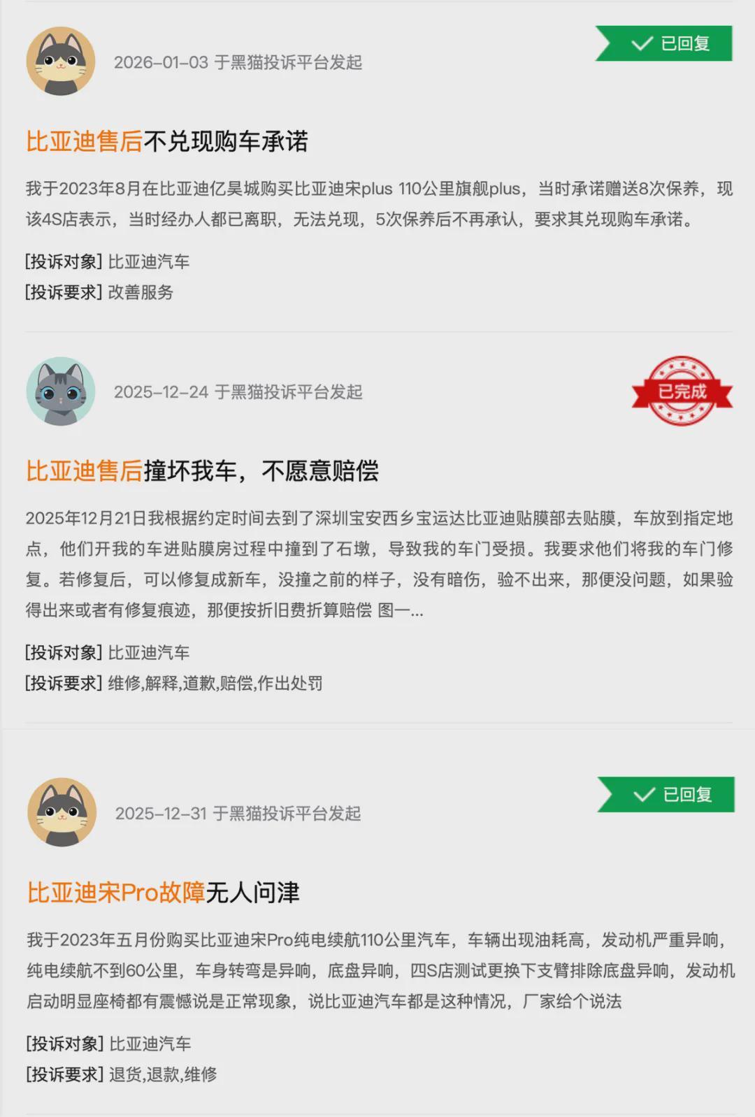 图/黑猫投诉平台关于比亚迪的投诉